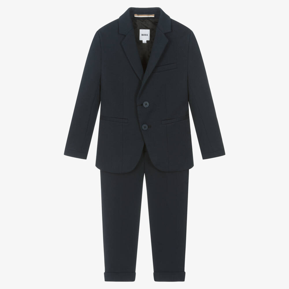 Smart navy blue Milano jersey suit for boys by BOSS. The jacket is lined in silky satin for a luxurious feel and features the designer's signature colours and monogram logo. It has a chest pocket and two front pockets, with a vent on the back for ease of movement. Fastening with a zip and button, the trousers have front and back pockets, with an adjustable waist for an ideal fit. Adding a subtle designer finish, there is a signature tricolour trim on the front and a rubberised tonal logo on the back.