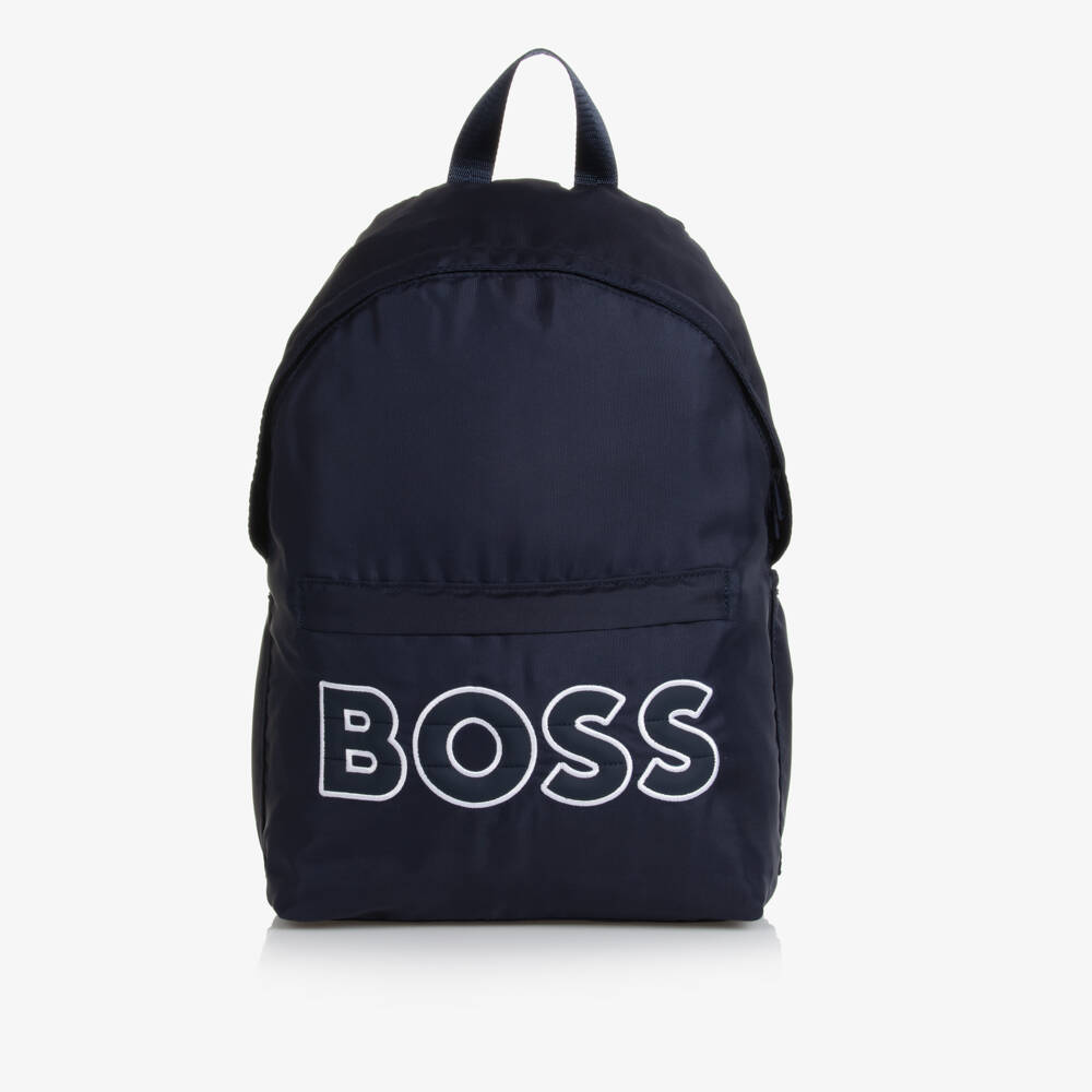 Navy blue backpack for boys by BOSS, made in silky textured canvas. The spacious main compartment has a velcro fastening pocket and fastens with a zip. There is a zip fastening pocket on the front with a large padded navy blue logo, edged in white embroidery. The back and adjustable shoulder straps are padded for comfort and there is a useful carry handle.