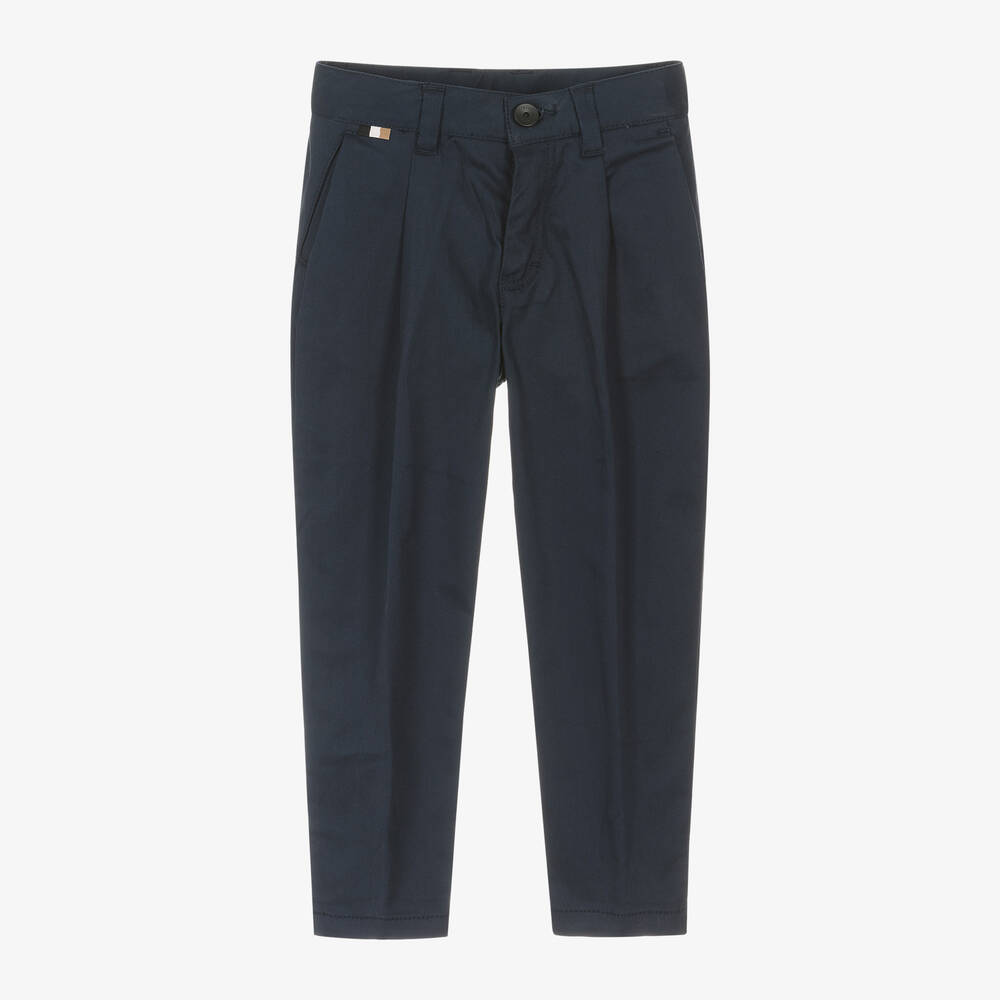 Smart casual navy blue chino trousers for boys by BOSS, made in soft cotton twill with slight stretch. This modern take on the classic look is styled with soft pleats on the front for a relaxed fit around the thighs and tapered towards the ankles. The brand's signature stripes can be seen on the cuffs when rolled up, and on the waist tab. Fastening with a button and zip on the front, the waistband is adjustable on smaller sizes and there are slanted front pockets and buttoned back pockets.