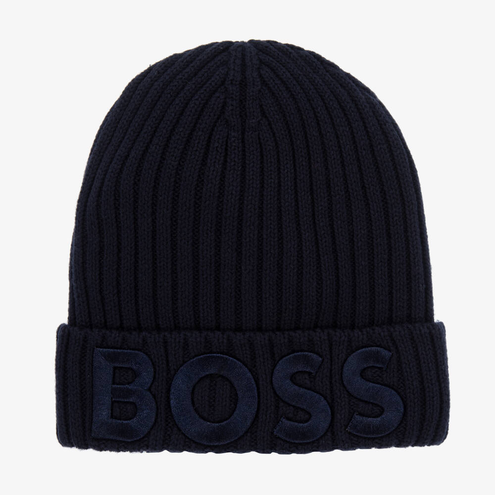 Navy blue beanie hat for boys by Boss, knitted in soft ribbed cotton. Warm and cosy, it has a turned-up brim with a large tonal embroidered logo on the front for a subtle designer statement.