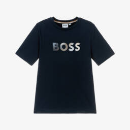 Casual navy blue cotton T-shirt for boys by BOSS, with a gradient-effect logo print on the front in navy blue, yellow and white. Made in soft, comfortable jersey, it has the label's signature tricolour trim on the inside of the neckline.