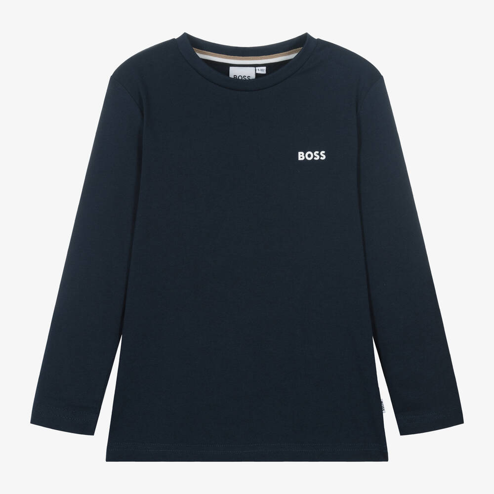 Mini-me navy blue long-sleeved top for boys by BOSS, made in soft cotton jersey. Simple but stylish, with a regular fit, this casual wardrobe staple has a white logo print on the chest and a black and white logo tab on the side. To complete the designer styling, it has the brand's signature striped trim inside the neck.