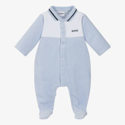 Boys navy blue and white velour babygrow by BOSS, with a wonderfully soft, luxurious feel. Ideal for keeping your little one cosy during the cooler months, it has a ribbed collar and concealed front poppers for easy dressing. The brand's logo is printed on the chest for instant designer appeal.