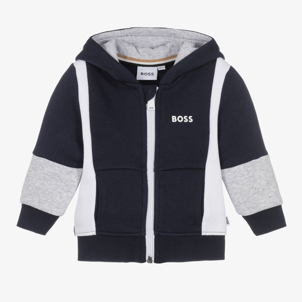 Navy blue zip-up hoodie for boys by BOSS, made in a soft mid-weight jersey with a fleecy inside. This comfortable hoodie has a white logo print on the chest and on the hood, for a distinctive design look. The hood is lined in grey marl jersey, with matching panels on the sleeves. White panels on the front coordinate with the exposed white zip fastening. Cosy ribbed trims and concealed front pockets complete the design.