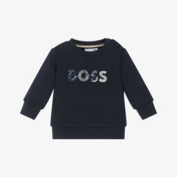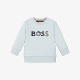 Pale blue cotton-blend sweatshirt for little boys by BOSS, with an embroidered logo on the front, adding a stylish designer touch. Casual and comfortable, it is made in mid-weight jersey, with a soft, fleecy inside for an extra cosy feel. There are popper fastenings on one shoulder for quick and easy dressing.