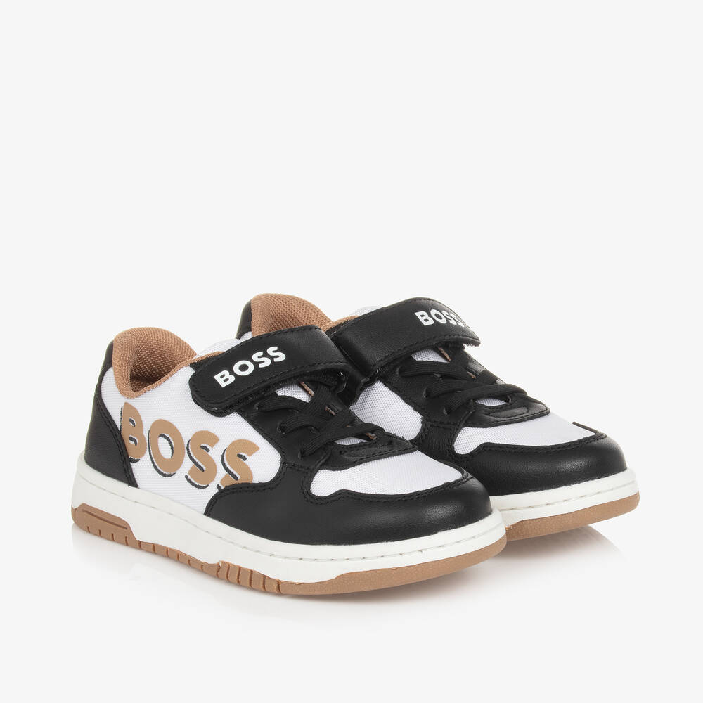 A pair of trainers for younger boys by BOSS, in the German brand's signature black, white and beige colours. Made in supple leather with white mesh inserts, they have logo prints on the side, tongue and heel for a signature designer look. Designed with elasticated laces for easy slip-on, they have a velcro strap for a secure, adjustable fit. This comfortable style has a soft mesh lining, a cushioned removable insole and a flexible, rubber outer sole, textured for improved grip.