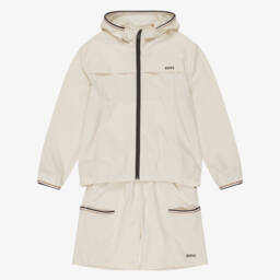 White and navy blue cotton shorts set for boys by BOSS, ideal for relaxed days. Made in soft, comfortable jersey, the lightweight T-shirt has a bold, pale blue logo printed on the front, with a cloud effect. The mid-weight shorts have a drawstring with branded end-caps for a great fit and useful side seam pockets.