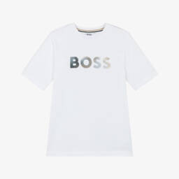 White T-shirt for little boys by BOSS, made in soft cotton jersey. It has a cool Double B monogram motif printed on the chest, and useful popper fastenings on one shoulder.
