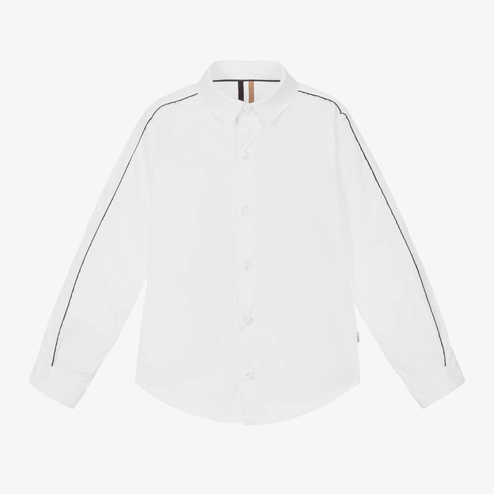 Smart white poplin shirt for boys by German brand BOSS, with narrow navy blue trims on the long sleeves. It is cut in a slim fit and made in a smooth cotton blend with a hint of stretch for extra comfort. It has a point collar and branded buttons on the front placket and cuffs.