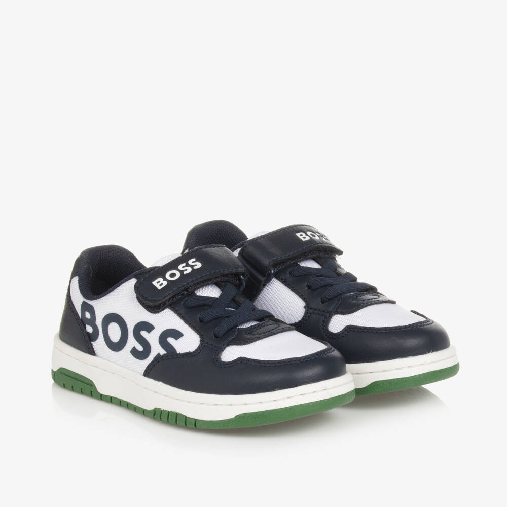 A pair of trainers for younger boys by BOSS, in navy blue, white and green. Made in supple leather with white mesh inserts, they have logo prints on the side, tongue and heel for a signature designer look. Designed with elasticated laces for easy slip-on, they have a velcro strap for a secure, adjustable fit. This comfortable style has a soft mesh lining, a cushioned removable insole and a flexible, rubber outer sole, textured for improved grip.