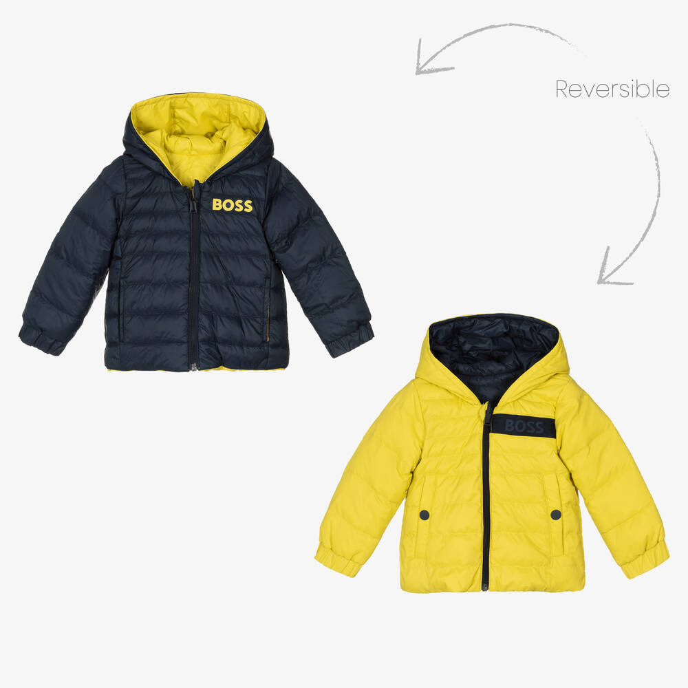 Versatile citrine yellow and navy blue reversible puffer jacket for little boys, by BOSS. Luxuriously padded with lightweight down for a warm fit, the bright yellow side has a navy blue logo panel on the chest, and popper fastening hand pockets. The navy blue reverse side has a yellow logo print on the chest, hidden hand pockets, and elasticated cuffs to keep your little one warm on colder days.
