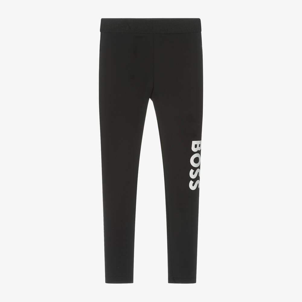 Silky smooth black leggings for girls by German brand BOSS, with a sporty look. Lightweight and full length, they have a comfortable, elasticated waistband and a large shiny silver logo printed on one leg, for instant designer appeal.