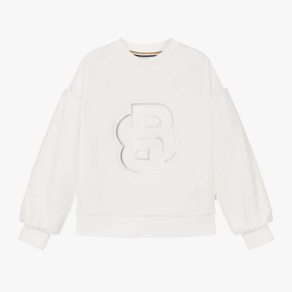 Super cool ivory cotton sweatshirt for girls by German brand BOSS, with a large, embossed silver Double B logo on the front. Made in soft, comfortable jersey, it has dropped shoulders with fun, faux fur, long sleeves and cosy, ribbed trims.