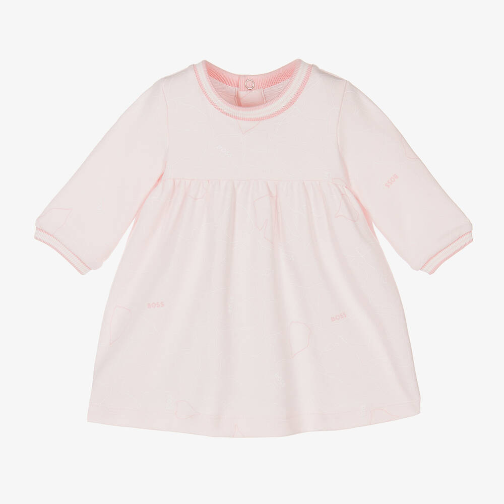 Cute and comfortable, a pale pink organic cotton dress for little girls by German designer BOSS, with a contrasting pink and white pattern of ginkgo leaves and logos. It has ribbed trims striped in shades of pink and a full, gathered skirt. There are branded popper fastenings on the back to assist with dressing.