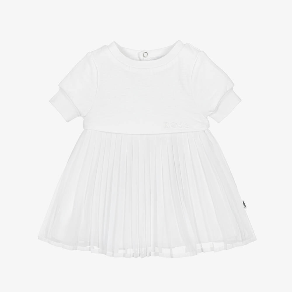 A charming white dress for little girls by BOSS. The bodice and lining are made from soft cotton jersey for extra comfort, and the skirt has a pleated chiffon overlay for an added feminine touch. There is a tonal embroidered logo on the waist and branded popper fastenings on the back for a signature finish.