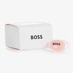 A pale blue BPA free dummy for baby boys and girls by BOSS, with a distinctive dark navy blue logo print on the front. The accessory is made up of a silicone teat in a comforting shape and a durable plastic shield. Helping to soothe your little one, the curved top fits easily under the nose and ventilation holes allow air to circulate.