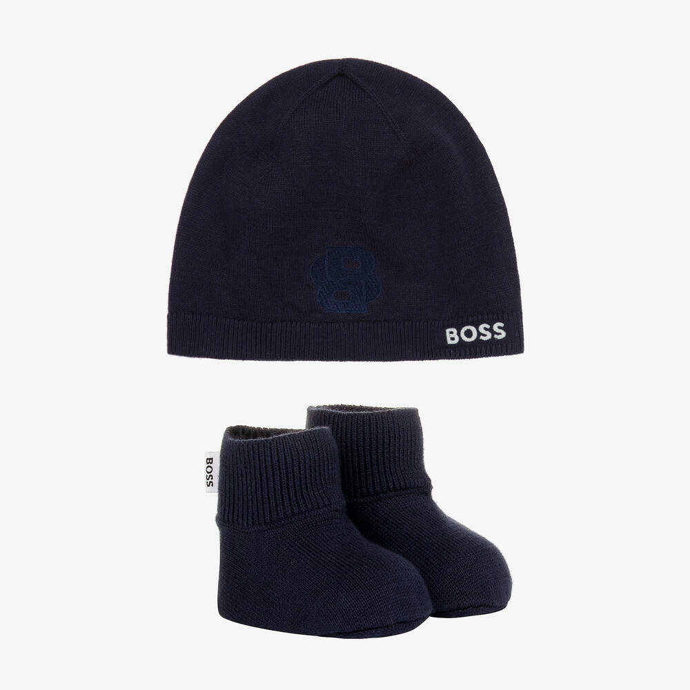 Navy blue knitted hat and booties set for baby boys and girls by BOSS, luxuriously presented in a gift box. Knitted in fine cotton, each piece in this set is delicately accented with subtle designer details.