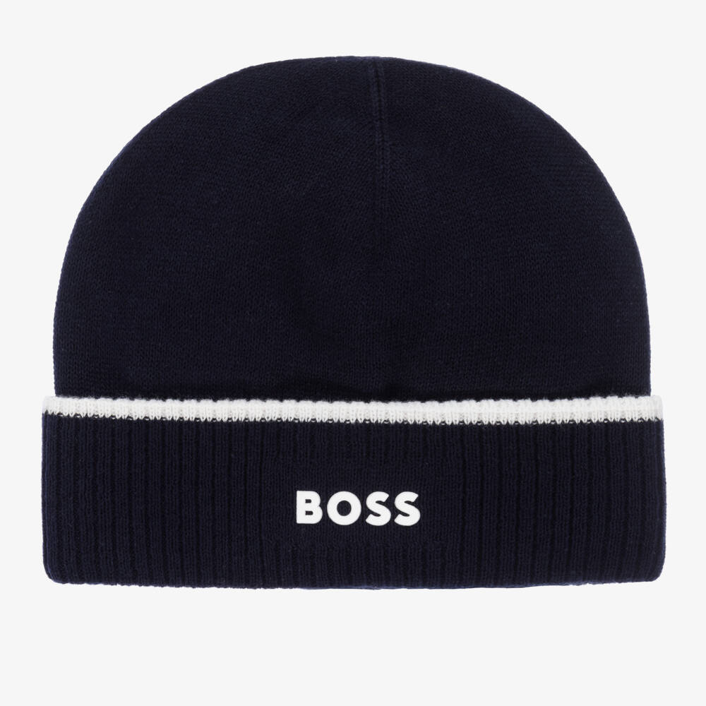 Little boys navy blue beanie hat from BOSS. The designer's white rubberised logo can be found on the white trimmed brim. It is knitted in a double layer of soft cotton for added warmth and comfort.