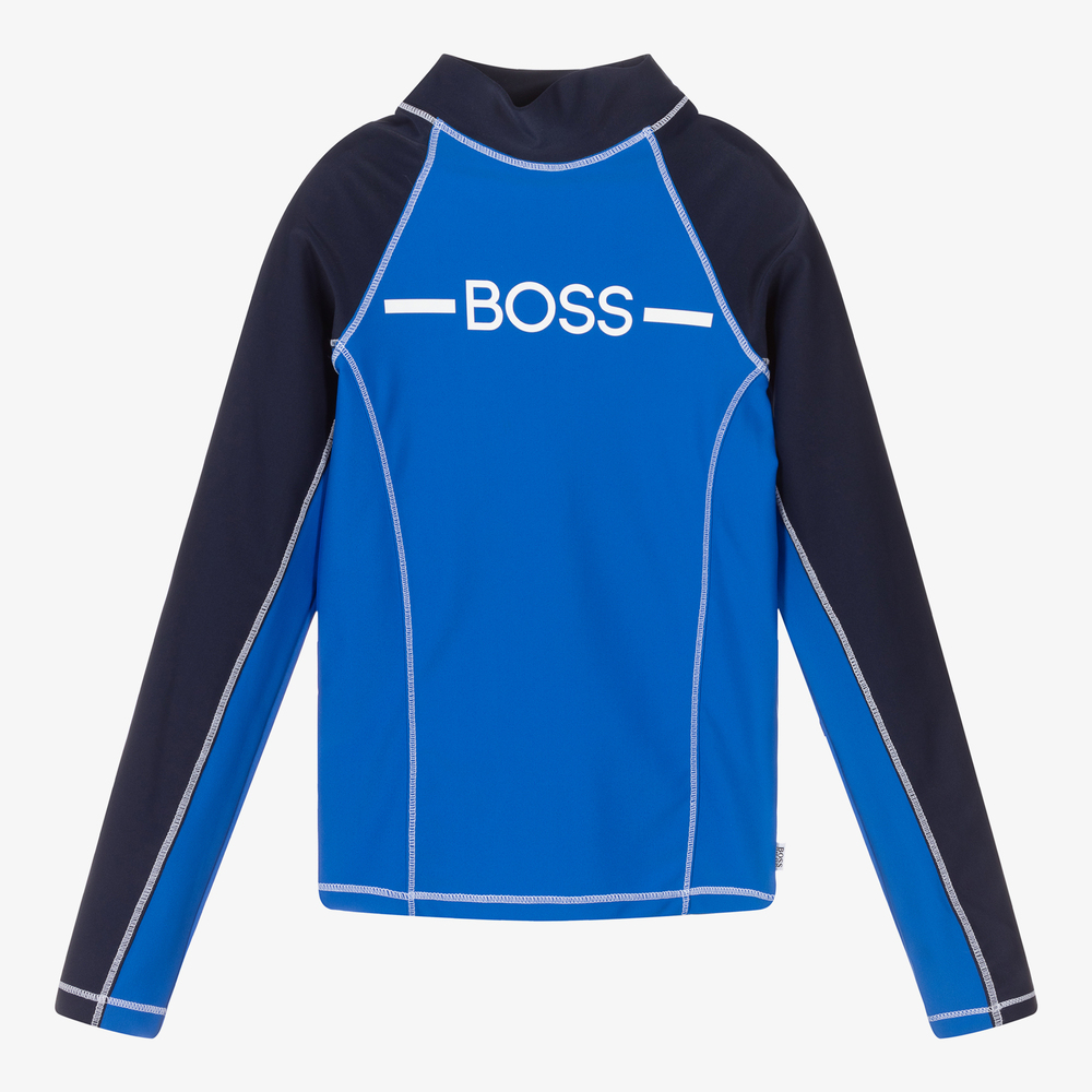 Teen boys blue sun protective top from BOSS Kidswear, made in silky smooth and stretchy polyester, with UPF40+. The brand's logo is printed in white on the chest and its has contrasting navy blue sleeves and white seam stitching.