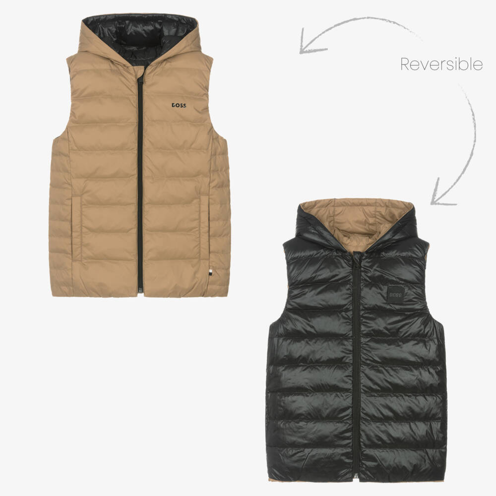 A reversible hooded gilet for teen boys by BOSS, in the brand's signature beige and black hues. Cool for layering, it has a logo print on one side and a rubberised logo on the reverse for a contemporary look. This zip-up water-repellent layer is down-filled for warmth, with pockets on each side.