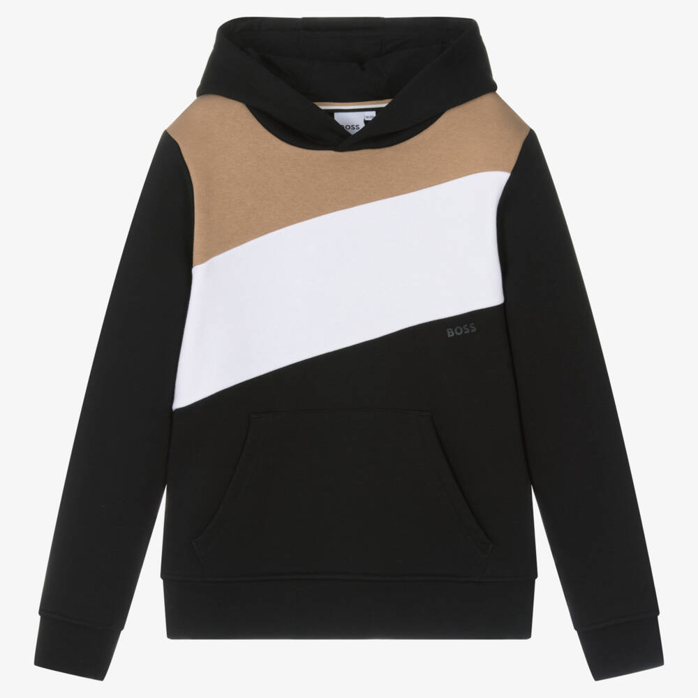 As seen in the main collection, this colourblock hoodie for teen boys is by BOSS. In the brand's distinctive black, white and beige colours, it has ribbed trims and a sporty pouch pocket on the front. Made in comfortable cotton jersey, it has a cosy fleecy inside and ribbed trims. There is a small rubberised logo on the front, and a logo tab at the side seam, with signature striped trim on the inside neckline.