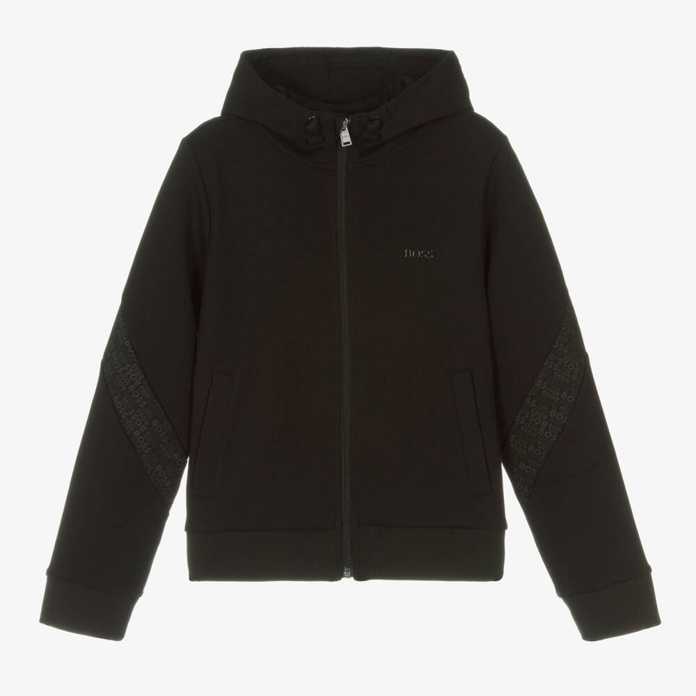 Black Mini-me zip-up top for teen boys by BOSS, with a tonal rubberised logo on the chest. Patterned with repeat logos on the hood, sleeves and back, this comfortable layer has a jersey-lined hood, a full zip front and useful pockets for storing essentials. Made in comfortable jersey, this classic design is finished with ribbed trims for a casual, designer look.