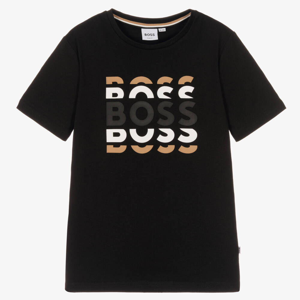 As seen in the main collection, a black T-shirt for teen boys by BOSS, with a split beige, white and black rubberised logo on the front. Made in cool and comfortable cotton jersey, this slim fit T-shirt has a classic ribbed crew neck, with matching beige, white and black striped trim. There is a small white and black logo tab on one side for a discreet branded finish.