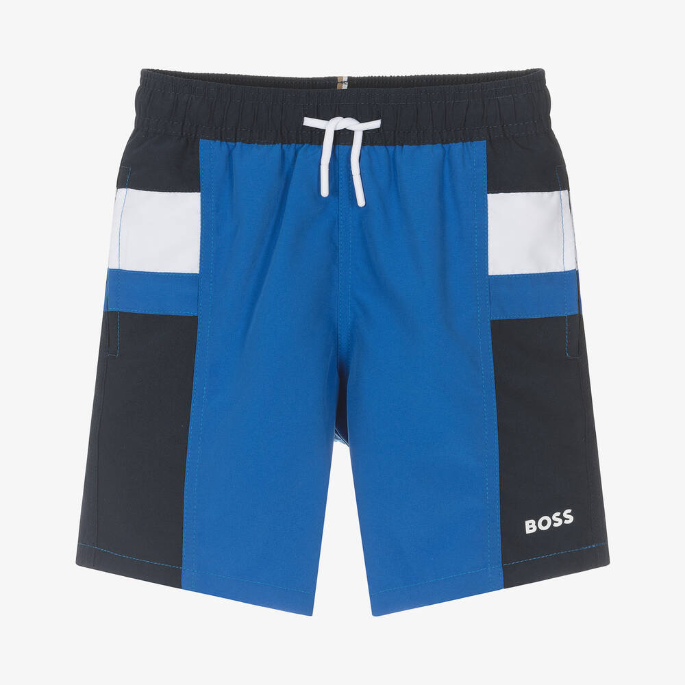 In navy blue, royal blue and white, these colourblock swim shorts for teen boys are by BOSS. Silky smooth with a lightweight mesh lining, they have an elasticated drawstring waist for comfort, and concealed side seam pockets. There is a white logo print on one leg and signature striped trim on the inside waist for a branded finish.