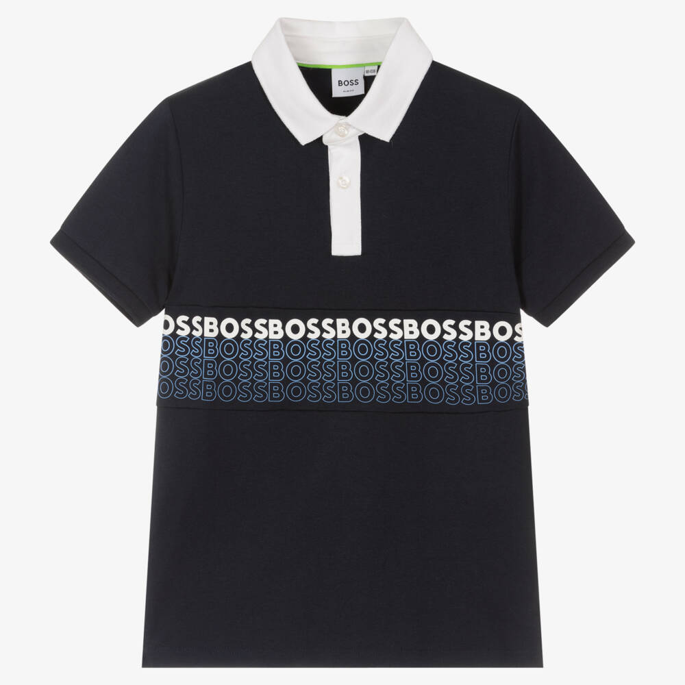 Navy blue Mini-me polo shirt for teen boys by BOSS, characterised with a blue and white stacked logo print across the front. Made in comfortable cotton piqué, this casual staple has a ribbed collar and cuffs, with vented sides for a sporty appeal. In classic polo style, there are branded fastenings on the white button placket.