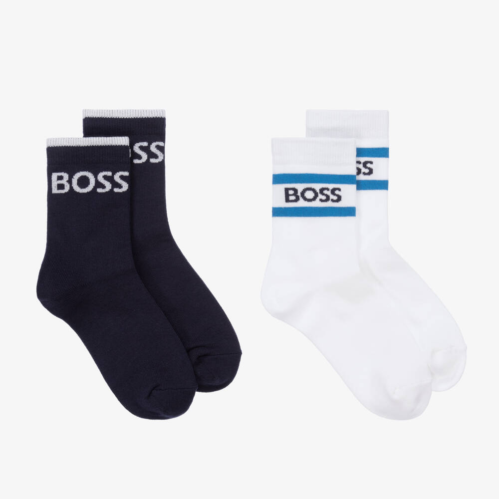 White and navy blue socks for teen boys by BOSS, in a handy pack of two. Made in a soft and stretchy cotton blend, these designer socks are finished with distinctive logo designs and sporty stripe details.
