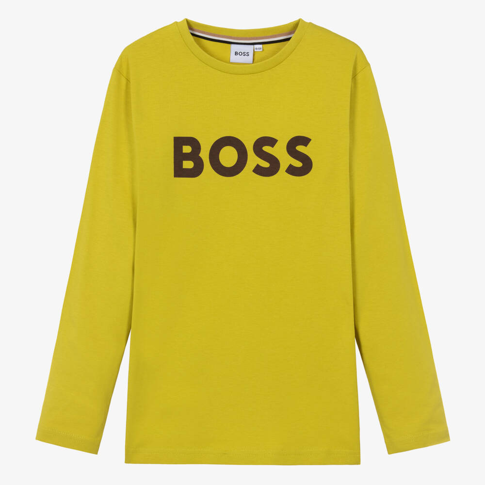 Green long-sleeved top for teen boys by BOSS, as seen in the adult collection. It is printed on the front with a bold brown logo for instant designer appeal. Ideal for layering, this casual wardrobe staple is made in comfortable cotton jersey.