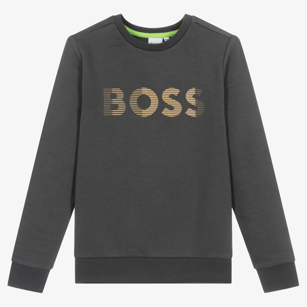 Dark grey sweatshirt for teen boys by BOSS, as seen in the adult collection. It is printed on the front with a gold gradient stripe logo for instant designer appeal. Made in comfortable cotton-blend jersey, it has a cosy fleece feel inside and ribbed trims for a casual finish.