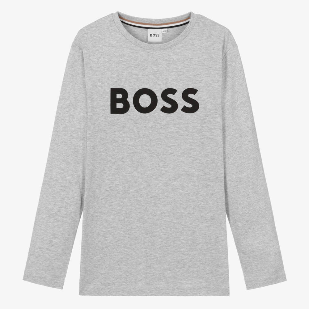 Grey marl long-sleeved top for teen boys by BOSS, as seen in the adult collection. It is printed on the front with a bold black logo for instant designer appeal. Ideal for layering, this casual wardrobe staple is made in comfortable cotton jersey.