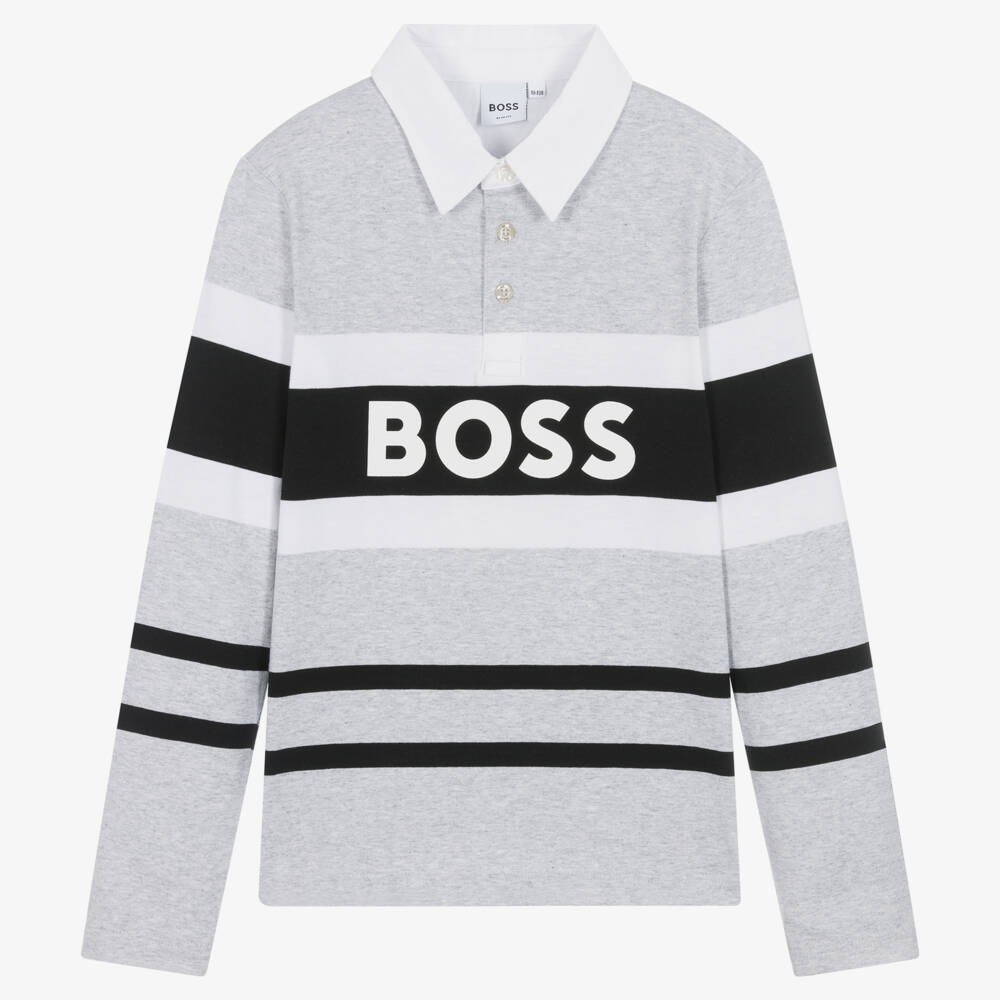 Long-sleeved BOSS top for teen boys in grey, navy blue and white, with a logo print across the front. Made in comfortable cotton jersey, it has classic rugby shirt styling, with a cotton twill collar, horizontal stripes and a split hem. Completing the designer look, it fastens with branded buttons and has a logo tab on the side seam.