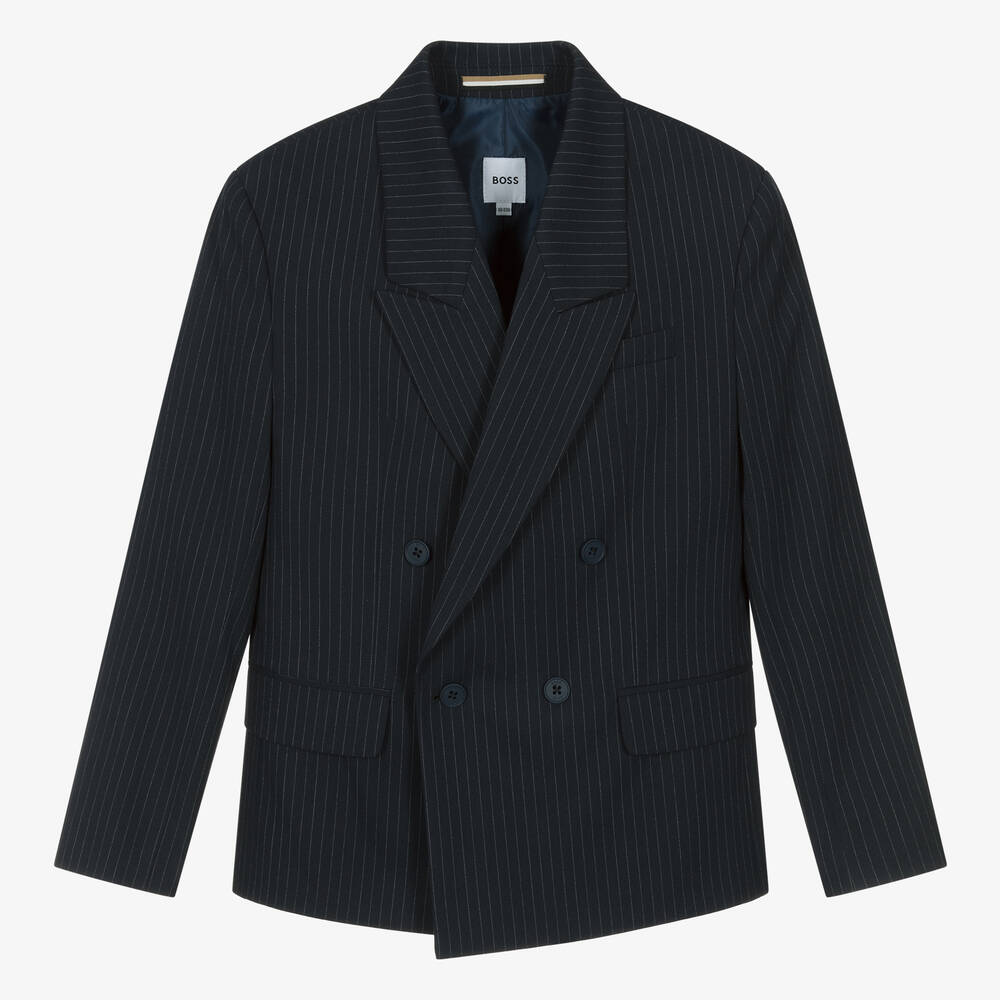 A smart navy blue blazer for teen boys by BOSS, with a classic pinstripe design. In a double-breasted style, this tailored jacket has notched lapels and pockets on the front. Woven in a soft viscose blend with a silky lining, it has a useful internal pocket and fastens neatly with branded buttons.
