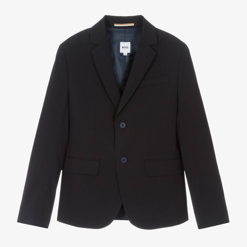 Smart navy blue blazer for teen boys by BOSS, featuring the brand's signature striped trim inside the collar. This tailored single-breasted blazer is made in a soft wool blend with a silky lining. It has notched lapels, decorative buttons on the cuffs and a buttoned internal slip pocket. To complete the formal look, it fastens with branded buttons and has a chest and flap pockets on the front.