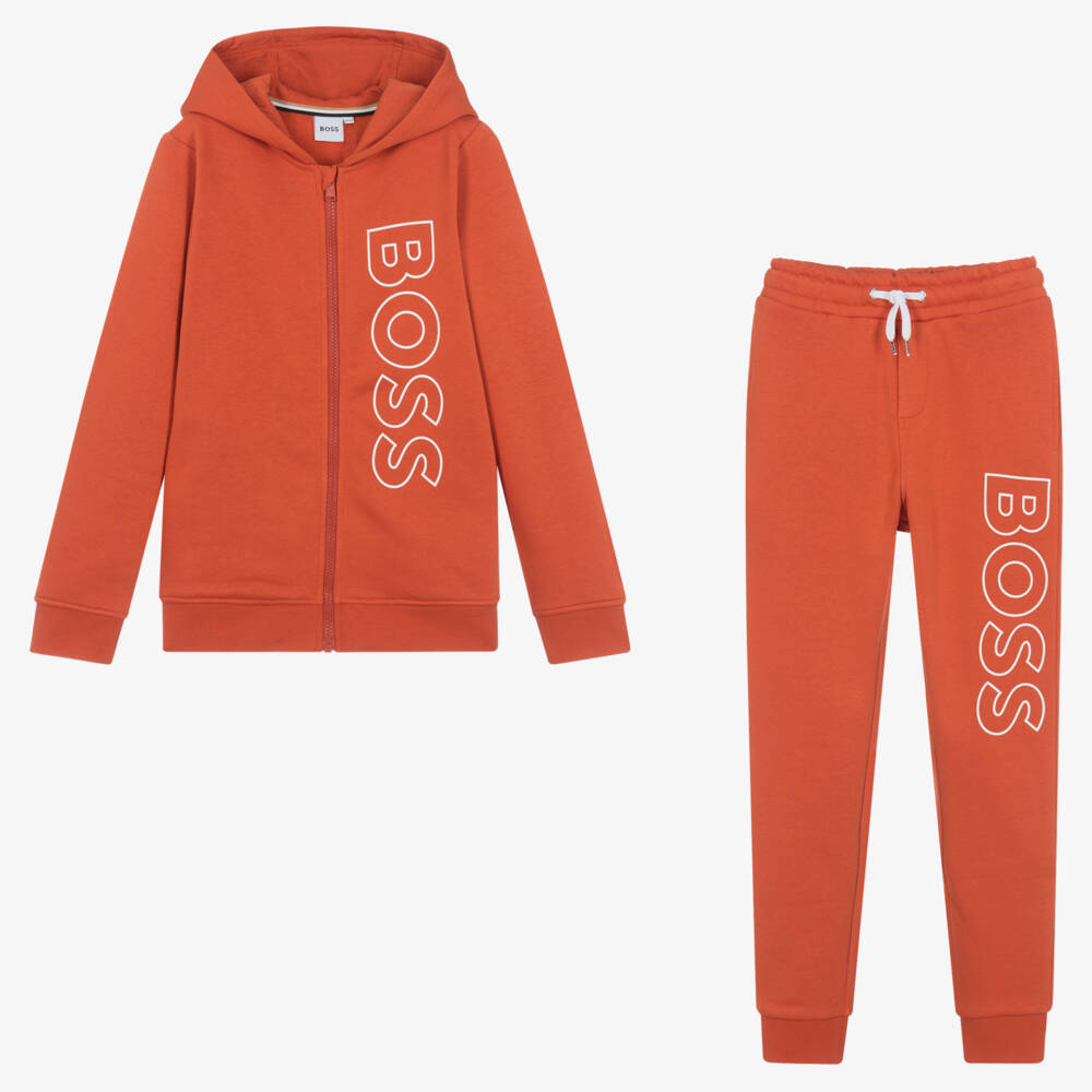 As seen in the main collection, this dark orange tracksuit for teen boys is by BOSS. For instant brand recognition, it has statement white logos on the front. Comfortable whether active or lounging, it is made in soft cotton-blend jersey with a cosy fleecy inside. The hoodie is trimmed with the brand's signature tricolour stripes and has an exposed front zip fastening. The joggers have an elasticated drawstring waist and both pieces have concealed side seam pockets.