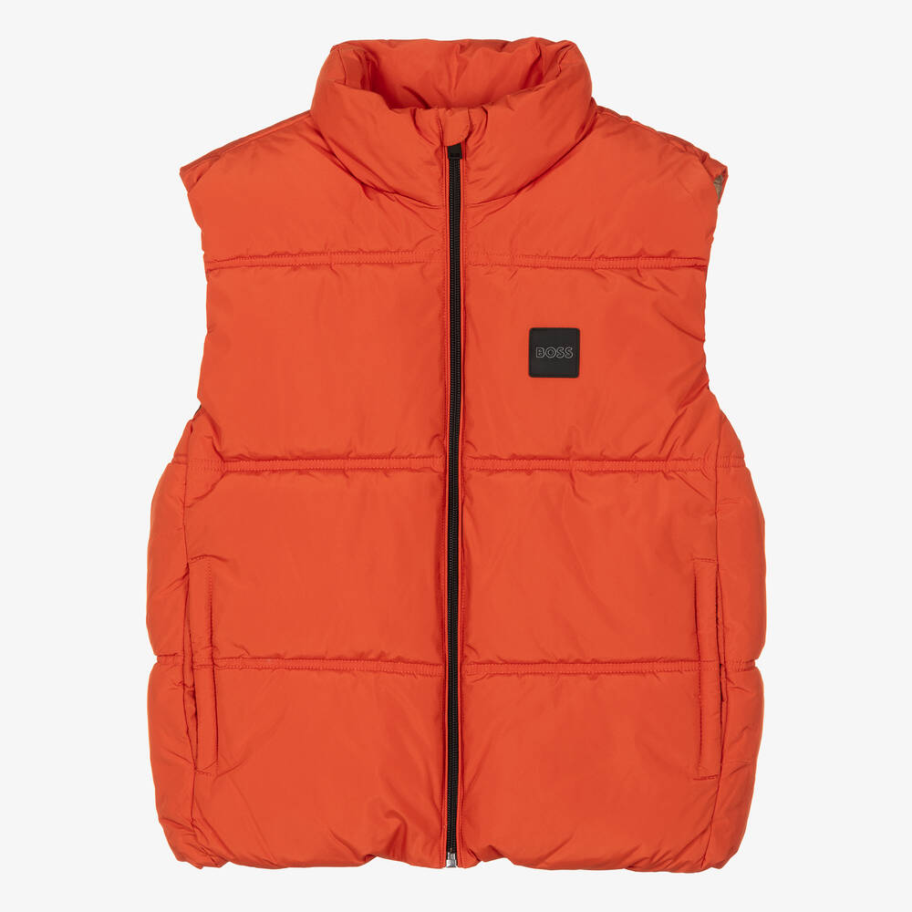 Cool burnt orange puffer gilet for teen boys by BOSS, with a rubberised logo patch on the chest for instant designer appeal. An ideal layering piece, it is made in a warmly padded, water-repellent fabric. The silky lining is designed in the brand's signature colours and there is a bold black logo print on the back of the collar. It has fleece-lined pockets on the front and fastens with a branded zip. This item contains at least 60% recycled material.