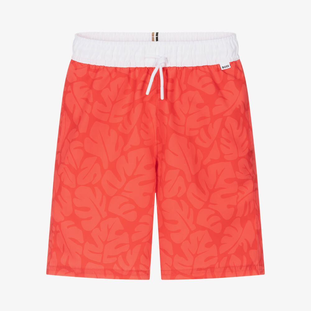Part of the brand's beach capsule collection, these cool red swim shorts for teen boys by BOSS are patterned in a tonal leaf design. The contrasting white elasticated waistband has the signature striped trims on the back and a drawstring to tie on the front. Silky smooth with soft and stretchy mesh lining for comfort, they feature a small logo tab and pockets on the side seams.