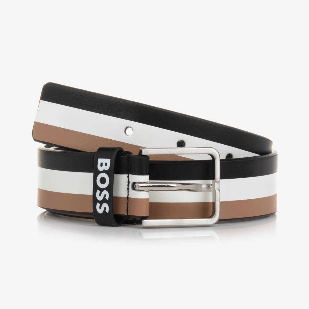 Faux leather belt for teen boys by BOSS in the brand's signature colours of black, white and beige. It has a bold white logo printed on the belt loop for an added designer statement. Smart and stylish, it fastens with a matt silver buckle.