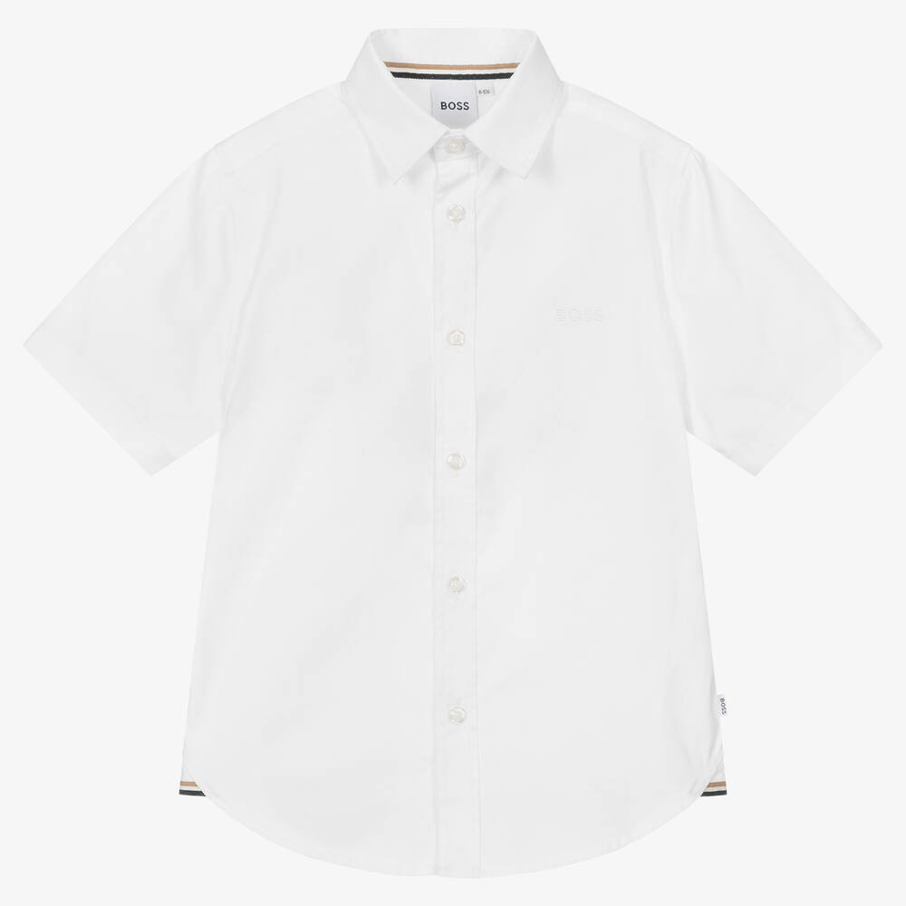 White short sleeve Oxford shirt for teen boys by BOSS, with a white embroidered logo on the front. Fastening with logo buttons, it also has a small white logo tab on the side seam for another subtle brand touch.