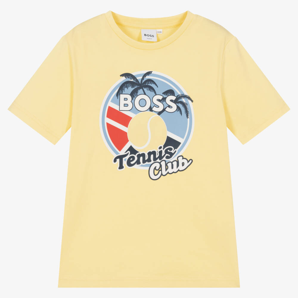 Sporty yellow slim fit T-shirt for teen boys by BOSS, made in soft cotton jersey. As seen in the main collection, it has a colourful tennis logo print on the front in blue, yellow and red.