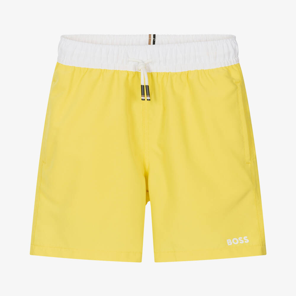 Teen boys bright yellow swim shorts by BOSS, with a white logo print on one leg. Fun to wear in the pool or sea, they are solid yellow when dry and as soon as they are exposed to water, a monogram logo pattern will show. The white elasticated waistband has the signature striped trims on the back and a drawstring to fasten and adjust on the front. Made in silky smooth fabric with soft mesh lining for comfort, they have pockets on the side seams.