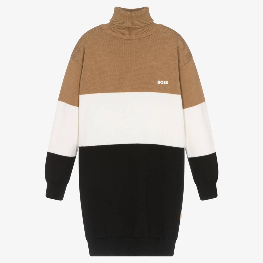 Stylish beige roll neck dress for teen girls by BOSS, striped in the brand's signature colourblock. A simplistic white logo is stamped on the chest for a logo-inspired look. It has a sleek roll neckline and stretchy ribbed trims for a comfortable style.