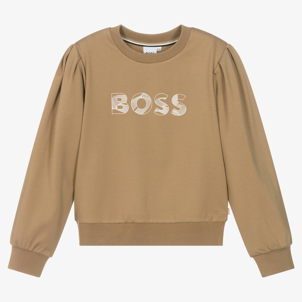 Teen girls beige sweatshirt by BOSS, printed with a linear white logo on the chest. Distinctly designer, it has puffed sleeves, a crew neckline and a silver glittery logo tab on the side seam. It is made in beautifully soft Milano jersey for a super comfortable and relaxed fit.