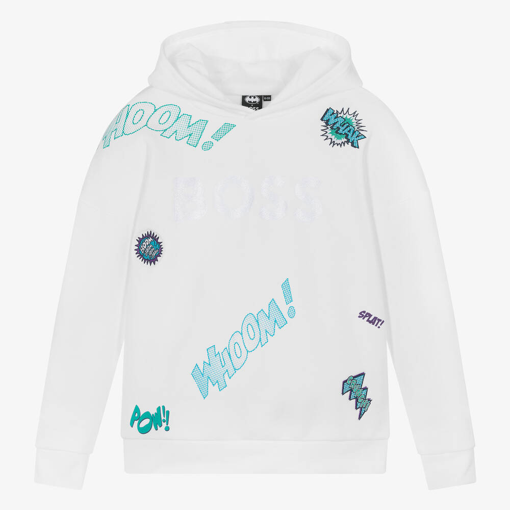 Teen girls white cotton hoodie by BOSS, with a signature logo embroidered on the front. In collaboration with Batman, this top has comic strip sound effects printed on the front for a bold, modern look. The iconic black Bat-Signal is printed on the top of the hood.