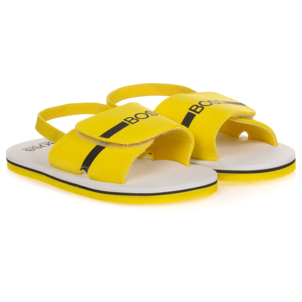 Yellow logo-branded sandals for boys by BOSS Kidswear. They have wide velcro fastening uppers, with an elasticated ankle strap. Their insoles are white, with a blue logo print and the outer soles are yellow.