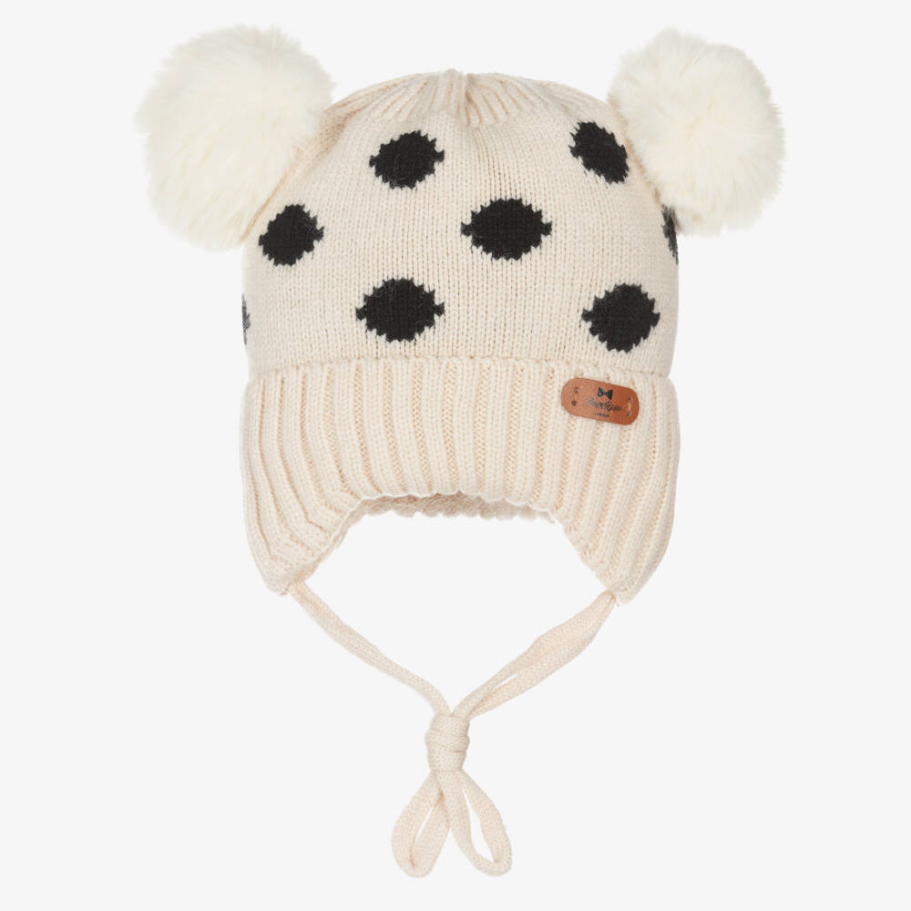 Beige hat for baby girls by Bowtique London. Knitted in a super soft angora blend, it has a black polka dot design and two faux fur pom-poms. There are tie fastenings that secure under the chin and a ribbed turn-up brim with a brown logo patch. It is lined in soft plush faux fur for extra warmth on cooler days.