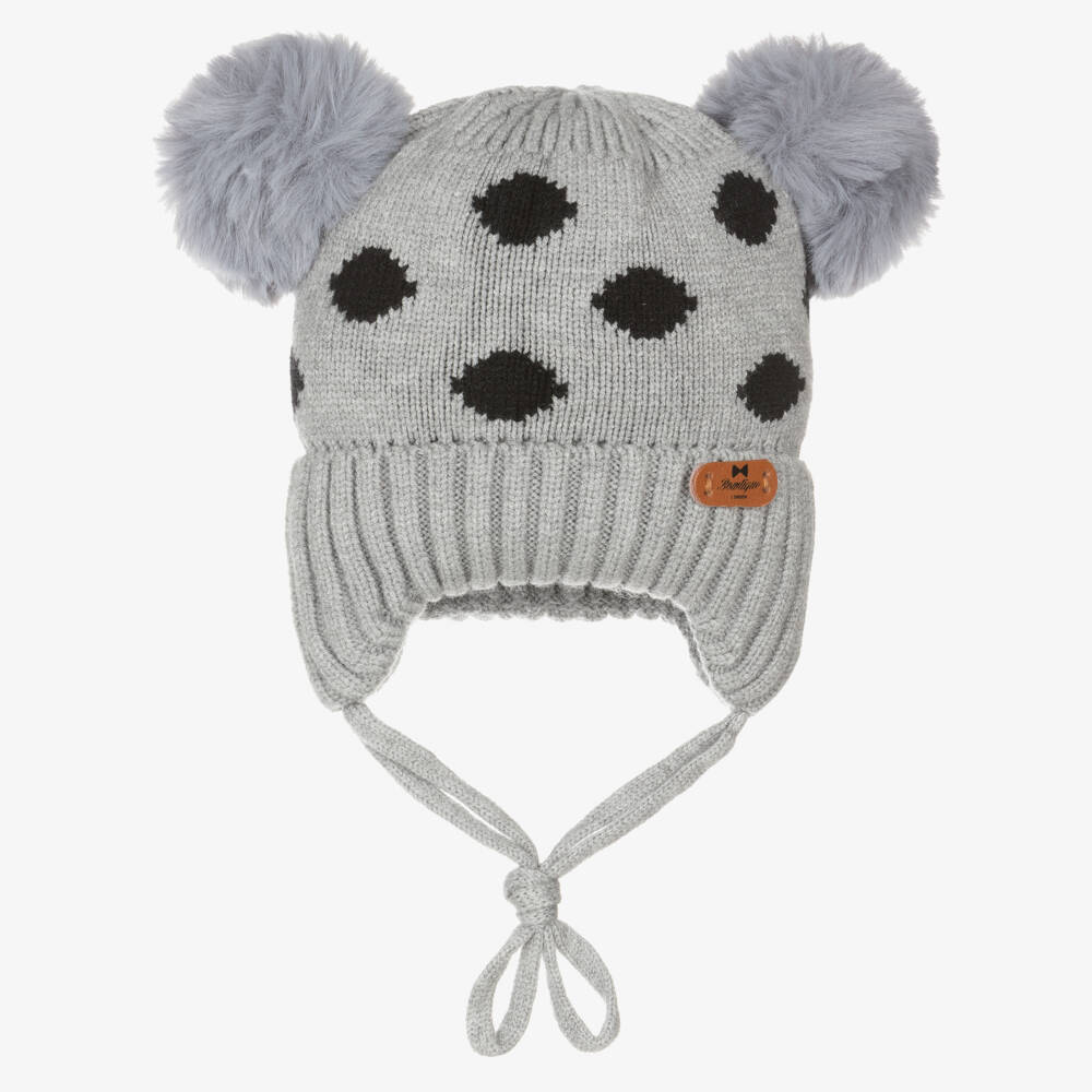 Grey hat for baby girls by Bowtique London. Knitted in a super soft angora blend, it has a black polka dot design and two faux fur pom-poms. There are tie fastenings that secure under the chin and a ribbed turn-up brim with a brown logo patch. It is lined in soft plush faux fur for extra warmth on cooler days.