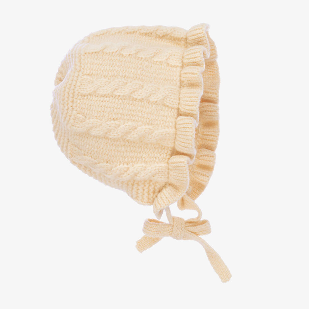 Cute ivory knitted bonnet for baby girls by Bowtique London, made in a soft and warm cotton blend. This cosy traditional style has beautiful cable detail and a pretty frilled edge, with a branded faux leather logo tab stitched on the side. There are knitted ties to fasten under the chin.